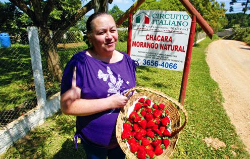 “Nos finais de semana e feriados, recebemos muitos visitantes. As crianças ficam encantadas com os pés de morango, que plantamos em estufamos. Explicamos sobre a preparação do terreno, o plantio, a colheita e as vantagens do morango orgânico, que é livre de agrotóxicos”, explica a responsável pela chácara, Vera Lúcia Maschio.