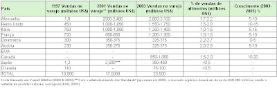 O mercado e consumo dos alimentos orgânicos, está crescendo no mundo inteiro. As taxas de crescimento dos países da União Européia durante os anos de 2000 e 2003 foram, em média, de 10 a 15 %. O mercado americano vem apresentando taxas de crescimento de 10 a 20%. (Willer e Yussefi, 2000). Houve um aumento de US$ 178 milhões em 1980 para US$ 6,4 bilhões em 1999. Em 2000, alcançou cerca de US$ 12 bilhões. Os EUA são exportadores para a Europa e Ásia, os principais produtos exportados são a soja, frutas frescas e secas, nozes , arroz e ingredientes alimentares. O Canadá importa dos EUA cerca de 85% de produtos consumidos, sendo a maioria alimentos processados e empacotados. Recentemente pesquisas constataram que 33 % dos consumidores americanos compram alimentos orgânicos regularmente. (Organic Monitor, 2003 citado em Yussefi e Willer, 2004).Outro exemplo de que o mercado esta em expansão são a Austrália e a Nova Zelandia, o mercado cresceu de EU 99,5 milhões em 2000 para EU 152 milhões em 2003.