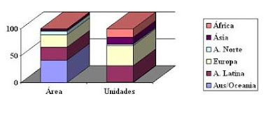 A América Latina e a Europa possuem, juntas, 47.3 % da área cultivada e 68.5% das unidades de produção, representando uma grande expansão e um potencial de produção e mercado significativo. Considerando a América do Norte totaliza-se 53.2% de toda área e 70.8 % do número de unidades de produção. Quanto à Ásia e a África, juntas possuem apenas 5% da área cultivada e 28.7% das unidades, valores esses considerados distantes do potencial existente de produção.